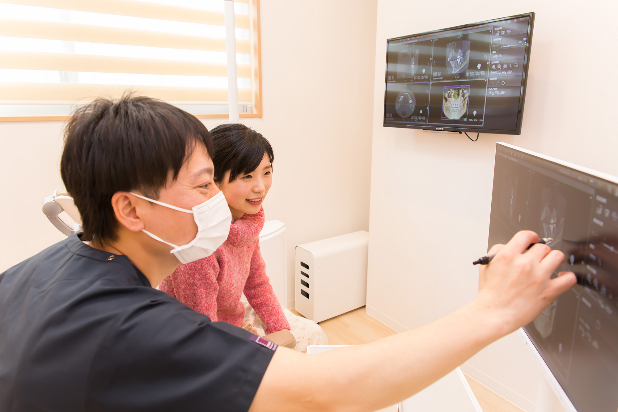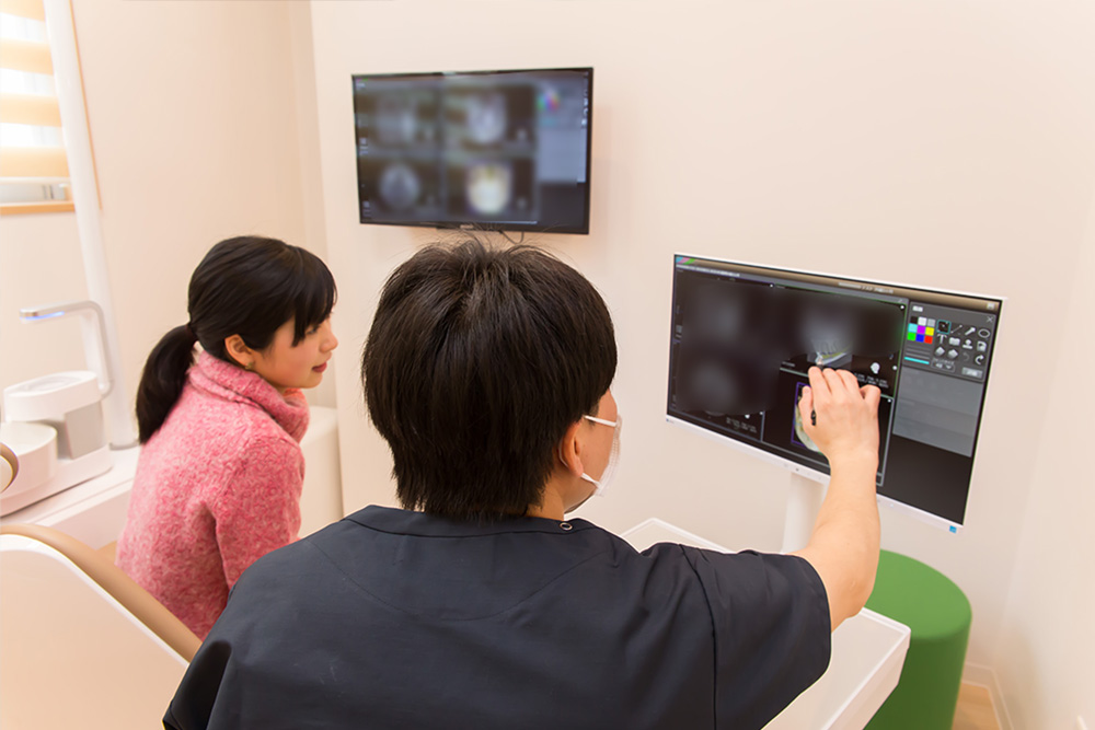 患者さまの負担軽減のため、各種設備も導入しています。型取りは従来の粘度状の材料ではなく口腔内スキャナーを使用し、治療計画にはCT撮影で骨の状態まで確認することで、より精密でリスクの少ない矯正治療を実現しています。